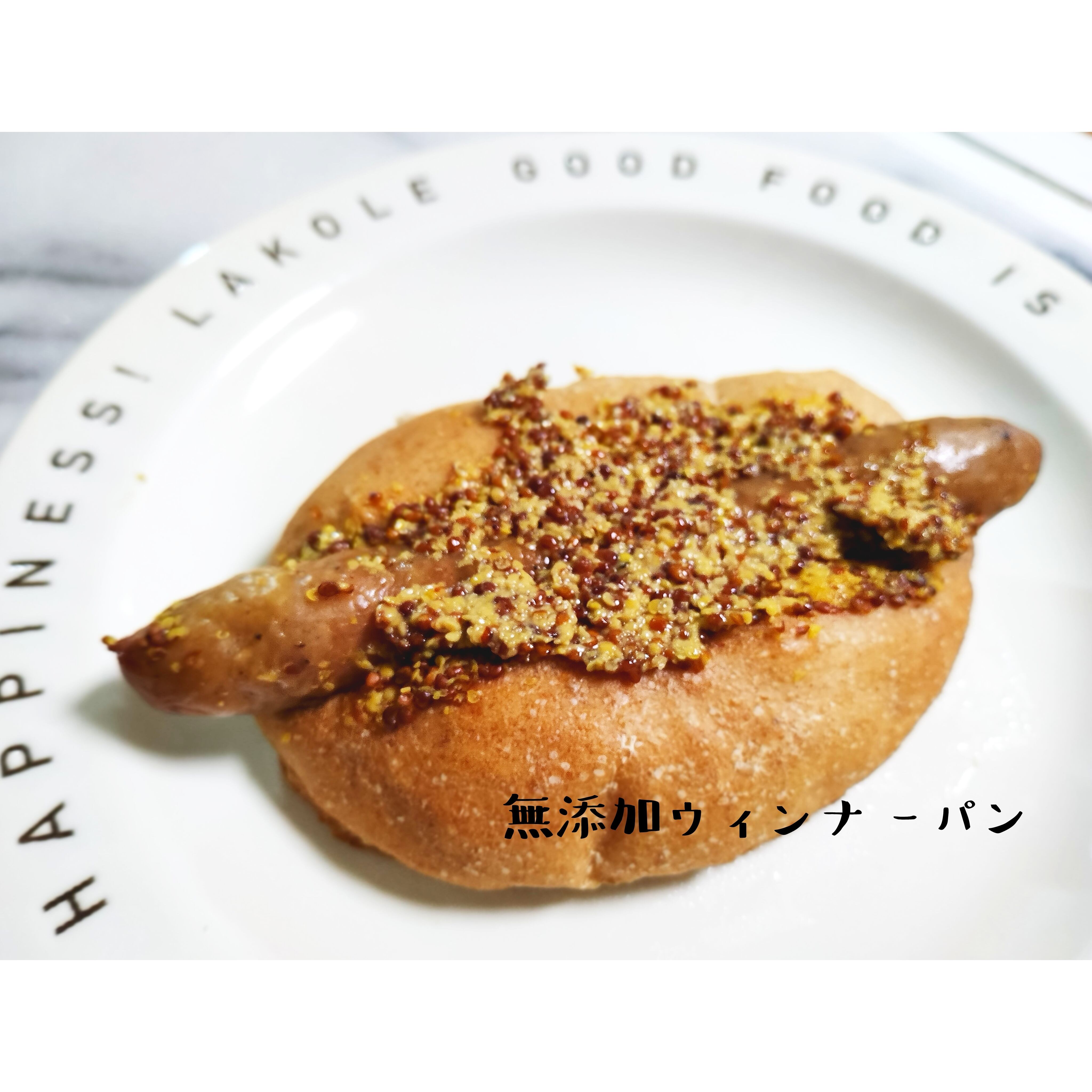 〇無添加ウィンナーパン:無添加ウィンナー(国産豚肉、食塩、香辛料、海藻粉末、自然由来デキストリン、砂糖、魚醤)、北海道産小麦(全粒粉40%)、牛乳、きび砂糖、北海道産バター、粒マスタード(フランス産)、有機ケチャップ、粗塩、無添加イースト